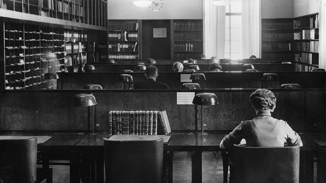 Eduskunnan kirjaston lukusali Eduskuntatalossa vuonna 1958. Kuva: Eduskunta