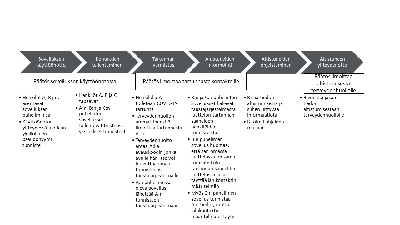 Sovelluksen käyttö perustuisi käyttäjän omaan päätöksentekoon ja aktiivisuuteen sovellusta käyttäessään, jolloin on otettava huomioon henkilön mahdollisuus toimia itsenäisesti tai tuetusti sovelluksen käyttäjänä sekä ymmärtää sovelluksen merkitys muun ohella tietosuojan näkökulmasta. Mobiilisovelluksen käytössä on erotettavissa yhtäältä sovelluksen lataaminen sovelluskaupasta ja käyttäminen puhelimessa sekä toisaalta sovelluksen kautta saadun mahdolliseen altistukseen liittyvän tiedon välittäminen terveydenhuoltoon.