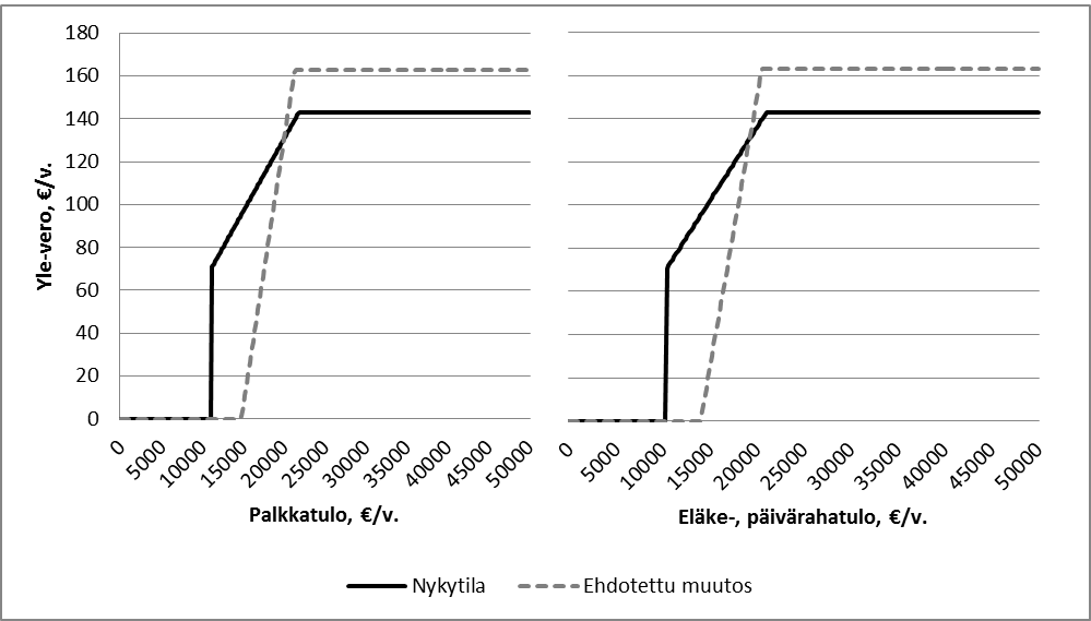 Alla olevassa kaaviossa esitetään palkkatulon sekä eläke- ja päivärahatulon perusteella laskettu yleisradiovero nykyisin, sekä ehdotetun muutoksen jälkeen.