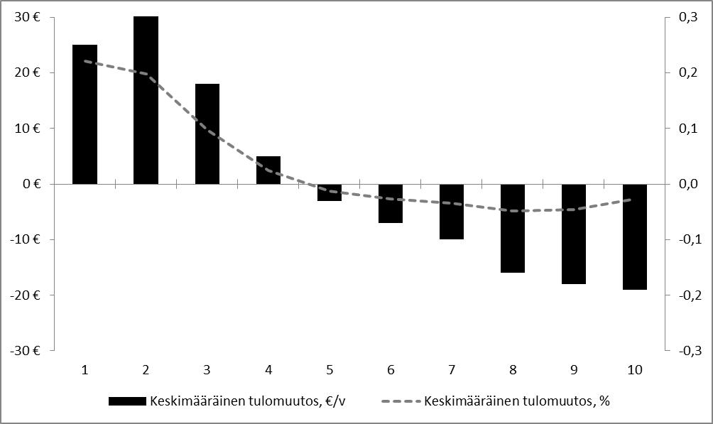 Ehdotus kaventaisi tuloeroja hieman, Gini-kertoimella mitattuna noin –0,03 prosenttiyksikköä. Alla olevassa kaaviossa esitetään ehdotetun muutoksen vaikutus käytettävissä oleviin tuloihin tulokymmenyksittäin.