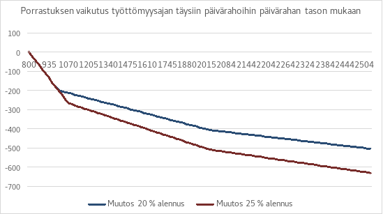 20 prosentin porrastus pienentäisi keskimääräistä täyttä päivärahaa noin 14 euroa päivässä eli noin 300 euroa kuukaudessa, ja 25 prosentin porrastus pienentäisi keskimääräistä täyttä päivärahaa noin 15,5 euroa päivässä eli noin 330 euroa kuukaudessa. Yli 170 päivää ansiopäivärahaa saaneilla päiväraha on keskimäärin pienempi kuin 41–170 päivää saaneilla. Tähän on todennäköisesti syynä ainakin se, että yli 170 päivärahaa saaneet ovat keskimäärin heikommassa työmarkkina-asemassa kuin alle 170 päivää päivärahaa saaneet, mikä näkyy myös henkilöiden etuutta edeltävässä palkkatasossa.