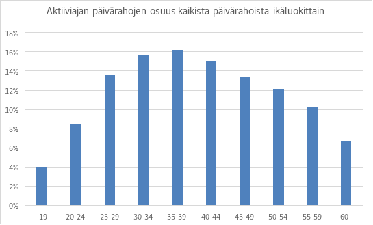 Muissa ikäluokissa yli 170 päivän kertymien osuus on pienempi ja melko tasainen, joskin nousee myös niissä jossain määrin iän myötä. Tason alennus 20 prosentilla kohdistuisi siis todennäköisesti erityisesti iäkkäisiin ansiopäivärahan saajiin. Kyseiseen kohderyhmään kuitenkin vaikuttavat myös erityisesti työttömyysturvan lisäpäivien poisto sekä tässä esityksessä ehdotettu kuntien työllistämisvelvoitteen lopettaminen. Nämä muutokset vähentävät merkittävästi yli 58-vuotiaiden ansiopäivärahan saajien määrää, minkä vuoksi porrastuksen vaikutukset kohdistuisivat arvion mukaan selvästi kuviossa 13 esitettyä pienempään ansiopäivärahan saajien joukkoon. Kuten myöhemmin tässä osiossa kuvataan, niillä ikäluokilla, joilla lisäpäiväoikeus on jatkumoa 12 kuukauden työssäoloehdon perusteella alkaneeseen ansiopäivärahan enimmäisaikaan, ansiopäiväraha maksettaisiin alennettuna myös lisäpäivien aikana.