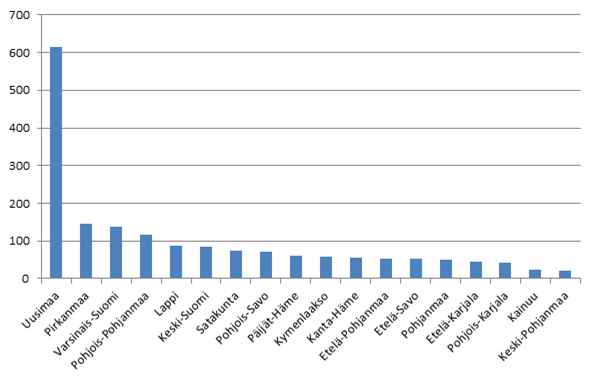 Pylväsdiagrammissa näkyy kiinteistöverokertymät maakunnittain vuoden 2017 maksuunpantujen kiinteistöverojen tiedoilla. Asteikolla kuvataan veron euromäärää miljoonina euroina, kun kiinteistöverotuotto on 1,79 miljardia euroa. Tuotosta reilu kolmannes kertyy Uudeltamaalta (34,3 %), noin kahdeksan prosenttia Pirkanmaalta (8,2 %) ja Varsinais-Suomesta (7,6 %). Kainuun ja Keskipohjanmaan osuudet ovat prosentin verran kokonaiskertymästä (1,3 % ja 1,1 % vastaavasti).