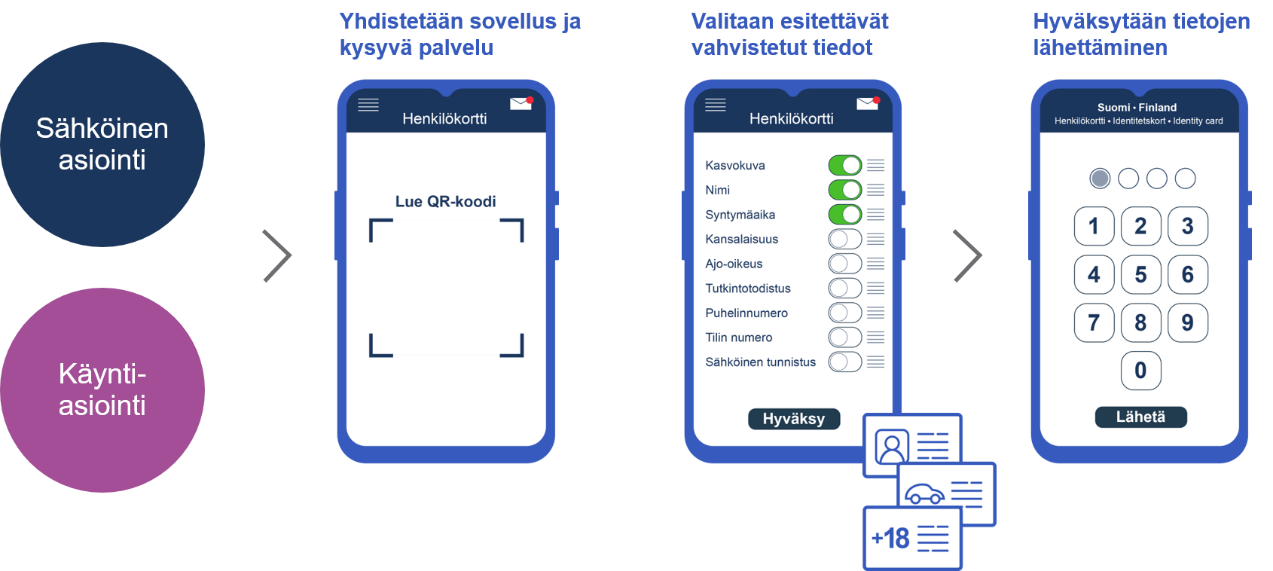 Ehdotetun 2 momentin mukaan digitaalisen henkilöllisyyden tietojärjestelmän tarkoituksena on mahdollistaa ulkomaalaisen digitaalisen asiointivälineen ja digitaalisesta henkilöllisyystodistuksesta annetun lain mukaisen digitaalisen henkilöllisyystodistuksen tuottaminen ja hyödyntäminen. Saman tietojärjestelmän ehdotettaisiin siis toimivan sekä digitaalisen henkilöllisyystodistuksen että ulkomaalaisen digitaalisen asiointivälineen teknisenä toteutuksena. Tietojärjestelmää käytettäisiin digitaalisen henkilöllisyystodistuksen tuottamiseen esimerkiksi siten, että digitaalisesta henkilöllisyystodistuksesta annetun lain mukainen digitaalisen henkilöllisyystodistuksen haltija, eli teknisellä alustallaan mobiilisovellusta käyttävä luonnollinen henkilö, todistaisi sähköisesti luottavalle osapuolelle henkilöllisyytensä ja päättäisi tässä yhteydessä tiettyjen vahvistettujen tietojen osoittamisesta luottavalle osapuolelle. Vahvistettuja tietoja voisi osoittaa digitaalisen henkilöllisyyden tietojärjestelmällä myös käyntiasioinnissa siten, että mobiilisovellusta käyttävä luonnollinen henkilö osoittaisi luottavalle osapuolelle henkilöllisyytensä mobiilisovelluksella ja tämän jälkeen osoittaisi käyntiasioinnissa tarvittavat vahvistetut tiedot luottavalle osapuolelle langattomia lähilukuyhteyksiä hyödyntäen.
