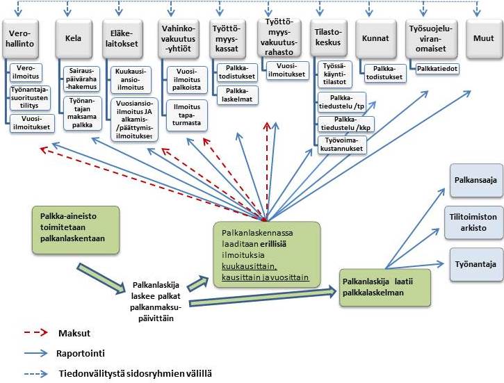 Suurilla ja monitoimialaisilla työnantajilla palkanmaksusta ilmoitettava tietosisältö voisi olla hyvinkin laaja, joillain pienemmillä työnantajilla taas perustilanteessa melko suppea. Jälkimmäistä tilannetta kuvaavat alla olevat esimerkit.