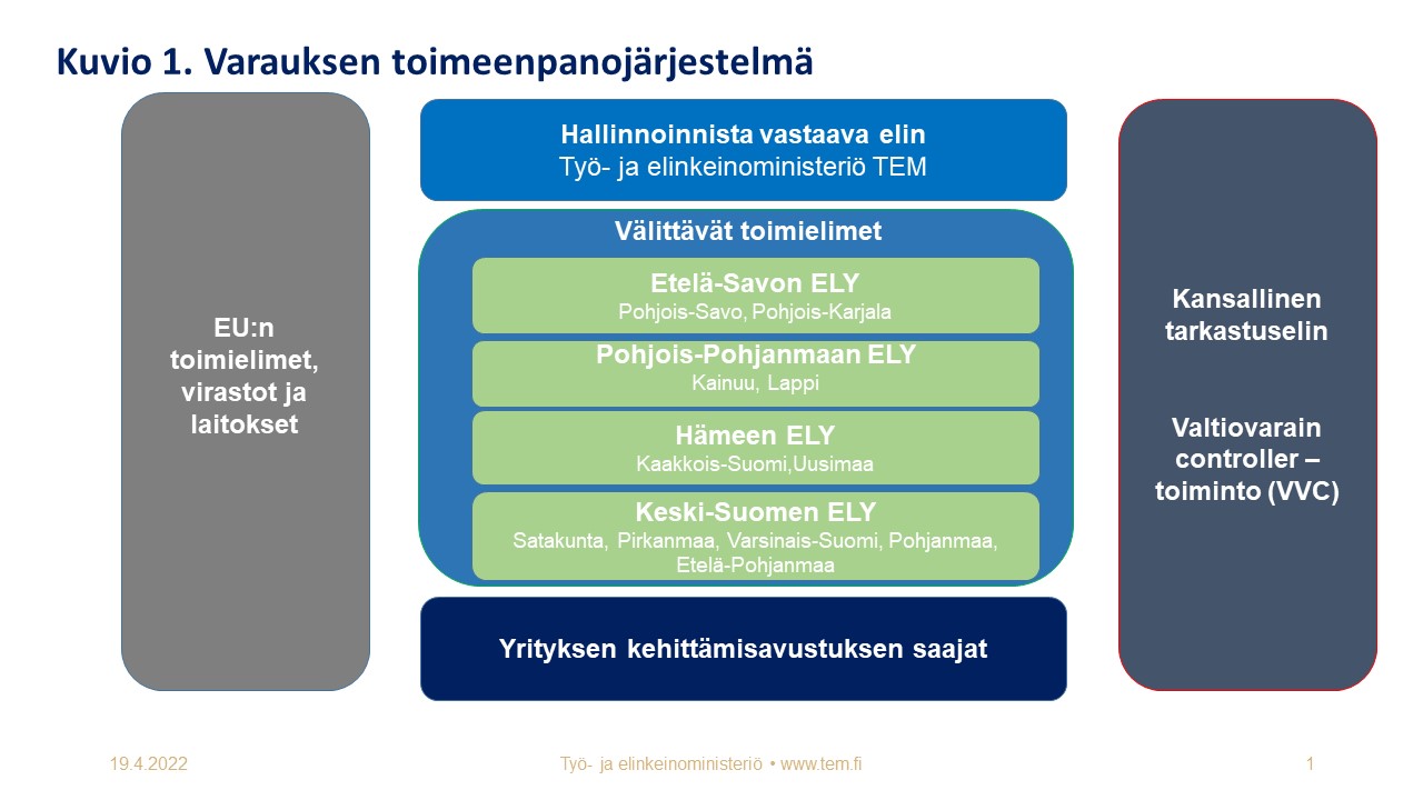 Työ- ja elinkeinoministeriö vastaisi EU-asetuksen säännösten mukaisesti komissiolle toimitettavaan varauksesta maksettavaa rahoitusosuutta koskevaan hakemukseen sisällytettävien tietojen oikeellisuudesta sekä hakemuksen toimittamisesta komissiolle. Työ- ja elinkeinoministeriön antama johdon vahvistuslausuma olisi EU-asetuksen 11 artiklan 1 kohdassa viitatun varainhoitoasetuksen 63 artiklassa tarkoitettu jäsenvaltion lausuma siitä, että varat on käytetty aiottuun tarkoitukseensa, että hakemuksen yhteydessä toimitetut tiedot ovat täydelliset, paikkansapitävät ja luotettavat ja että käytössä olevat valvontajärjestelmät antavat riittävät takeet siitä, että varoja on hallinnoitu kaikkien sovellettavien sääntöjen mukaisesti moitteettoman varainhoidon periaatetta noudattaen. Moitteettoman varainhoidon periaatteet on määritelty EU:n yleisessä varainhoitoasetuksessa (Euroopan parlamentin ja neuvoston asetus (EU, Euratom) 2018/1046 unionin yleiseen talousarvioon sovellettavista varainhoitosäännöistä). Moitteettoman varainhoidon periaatteen mukaisesti unionin talousarvion määrärahat tulee käyttää taloudellisesti, tehokkaasti ja vaikuttavasti. Työ- ja elinkeinoministeriön tulee erityisesti vahvistaa, että sovellettavia sääntöjä on noudatettu eturistiriitojen välttämisestä, petosten ja lahjonnan ehkäisemisestä sekä päällekkäisen sääntelyn estämisestä. EU-asetuksen tarkoittamana hallinnoinnista vastaavana elimenä työ- ja elinkeinoministeriö laatisi varauksesta komissiolle annettavan varauksesta maksettavaa rahoitusosuutta koskevan hakemuksen vuonna 2024. Työ- ja elinkeinoministeriö olisi myös varauksen ennakkomaksusuoritukset vastaanottava kansallinen elin. Tehtävästä säädetään EU-asetuksen 14 artiklan 1 kohdan d alakohdassa. Työ- ja elinkeinoministeriö hoitaa myös Euroopan unionin alue- ja rakennepolitiikan ohjelman EU-varojen maksuliikennettä osana kirjanpitotoimintoa. Työ- ja elinkeinoministeriön tehtävänä julkisista yritystuista ja yrityspalveluista vastaavana ministeriönä olisi varauksesta myönnettävien avustusten yhteensovittaminen muiden EU:n ja kansallisten tukijärjestelmien kanssa. Ministeriön tehtävänä hallinnoinnista vastaavana elimenä on vahvistaa varauksen varoista rahoitettavien hankkeiden EU-asetusta täydentävät tarkemmat valintaperusteet ja -menettelyt.