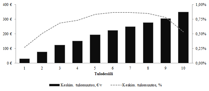 Alla olevaan kuvioon on koottu edellä mainittujen tuloveroperusteisiin tässä esityksessä tehtyjen muutosehdotusten yhteisvaikutukset tulodesiileittäin. Kuviosta käy ilmi, että verotus kevenee kaikissa tulodesiileissä hieman. Vaikutus on euromääräisesti suurin tulodesiileissä 6—10, eli keski- ja suurituloisilla kotitalouksilla. Vaikutus on suhteellisesti suurin tulodesiileissä 5—9. Kuviossa esitetyt muutokset on laskettu OECD:n modifioidun ekvivalenssi-asteikon mukaisilla kotitalouskohtaisilla ekvivalenteilla tuloilla.