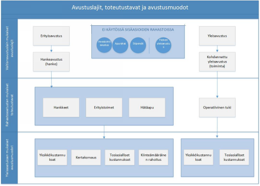 10 §.Avustuslajit. Pykälän 1 momentin mukaan avustus voitaisiin myöntää erityisavustuksena tai kohdennettuna yleisavustuksena. Sisäasioiden rahastoissa sovellettavaksi tulisivat valtionavustuslain mukaiset avustuslajit erityisavustus ja yleisavustus. Erityisavustus voitaisiin myöntää sisäasioiden rahastoissa hankeavustuksena. Yleisavustus voitaisiin myöntää kohdennettuna yleisavustuksena, joka kohdistuu tiettyyn osaan avustuksen saajan toiminnasta, koska rahastokohtaisissa asetuksissa määritellään operatiivisen tuen eli yleisavustustyyppisen avustuksen käyttökohteet näissä rahastoissa. Yleisavustusta ei näin voitaisi myöntää avustuksen saajan toimintaan yleisesti.