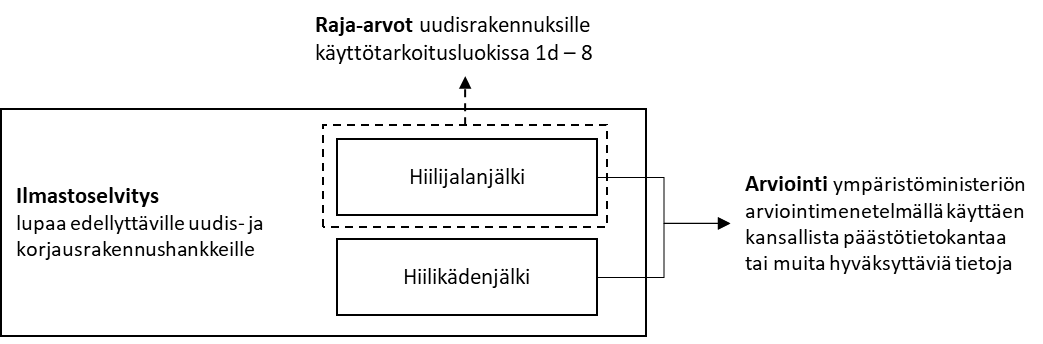 Hiilijalanjäljellä tarkoitettaisiin rakennuksen elinkaaren aikana syntyvien kasvihuonekaasujen kokonaismäärää ilmoitettuna hiilidioksidiekvivalenttien painona.