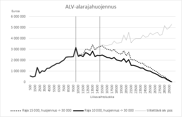 Alla olevassa kuviossa on esitettynä alarajahuojennuksen euromäärä liikevaihtoluokittain sekä 10 000 euron että 15 000 euron suuruisella alarajalla sekä yritysten maksettavan veron määrä ilman alarajahuojennusta.