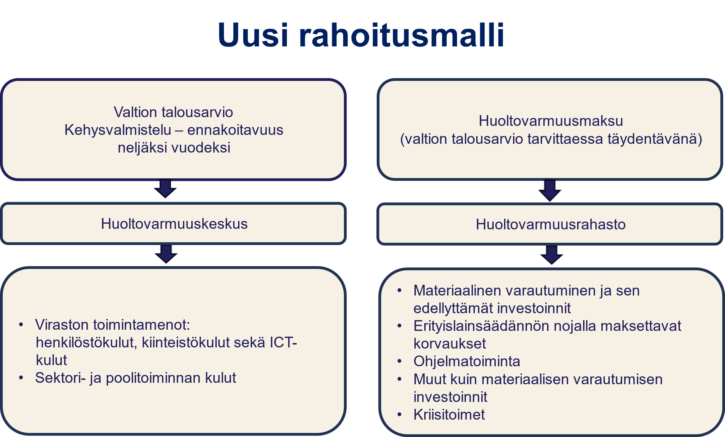Huoltovarmuuskeskuksen ja huoltovarmuustoimenpiteiden rahoitusmalli uudistettaisiin siten, että osa rahoituksesta tulisi valtion talousarviosta ja osa huoltovarmuusmaksusta, joka tuloutettaisiin edelleen huoltovarmuusrahastoon. Muutosten tavoitteena on varmistaa Huoltovarmuuskeskuksen ja huoltovarmuusrahaston riittävä rahoituksen taso.