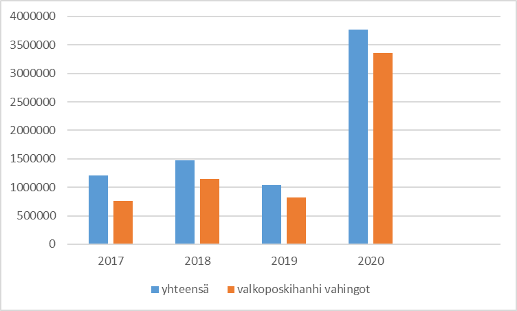 Rauhoitettujen eläinten aiheuttamat vahingot ovat lisääntyneet viimeisen viiden vuoden aikana merkittävästi. Rauhoitettujen eläinten maa-, metsä- ja kalataloudelle ja rakennuksille aiheutuneista vahingoista sekä maakotkan porotaloudelle aiheuttamista vahingoista maksettavia korvauksia maksettiin vuonna 2020 yhteensä noin 4,7 miljoonaa euroa. Maksettujen korvausten määrä on lisääntynyt merkittävästi viimeisen viiden vuoden aikana (edellä kuva 1). Viljelysvahingoista maksettavien korvausten määrän voimakkaaseen kasvuun on vaikuttanut erityisesti valkoposkihanhivahinkojen kasvu. Lisäksi ilmastonmuutoksen vaikutuksesta viljelysvahinkojen on arvioitu lisääntyvän nykyisestä. Maakotkan porotalousvahingoista maksettavien korvausten euromääräiseen kasvuun on vaikuttanut maakotkakannan vahvistumisen lisäksi korvauksen laskennassa käytetyn poronlihan hinnan nousu (edellä kuva 3).