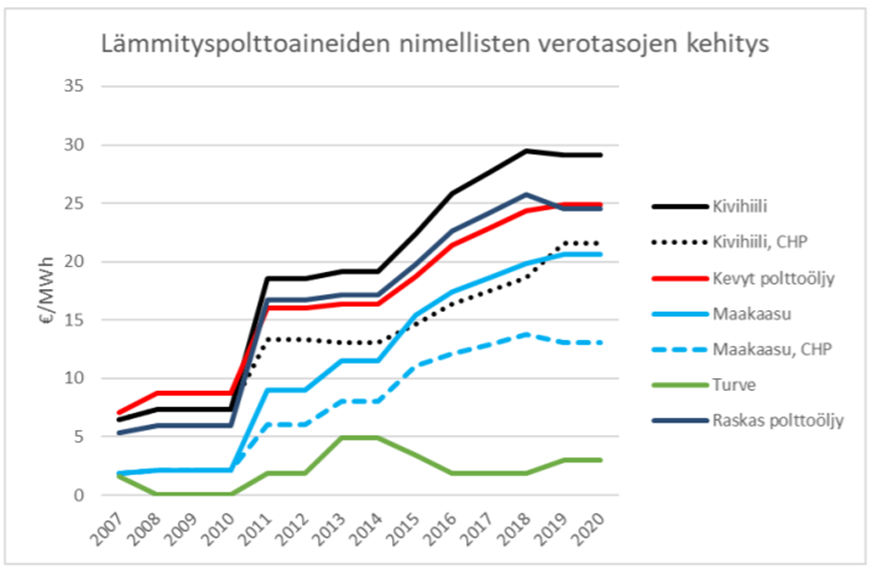 Taulukko 3. Lämmityspolttoaineiden nimellisiä verotasoja suhteutettuna polttoaineen energiasisältöön. Yhteistuotannon (CHP) nimellinen verotaso eritelty