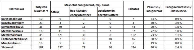 Taulukossa 7 on esitetty ehdotettujen muutosten toimialoittaisia vaikutuksia niille yrityksille, jotka tällä hetkellä ovat oikeutettuja energiaintensiivisten yritysten veronpalautukseen. Sähköveroluokan II alennuksen ja energiaintensiivisten yritysten energiaveron palautuksen poistaminen nostaisi tällä hetkellä palautuksen piirissä olevien yritysten verorasitusta absoluuttisesti ja suhteellisesti eniten metsä-, elintarvike- ja kemianteollisuudessa. Muutoin toimialatasoilla muutokset olisivat vähäisiä.