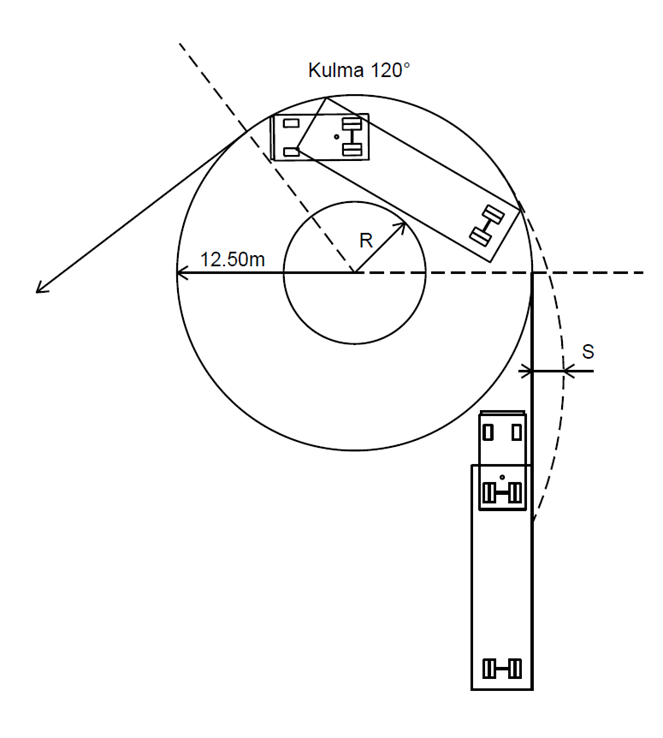 Pykälän 2 momentissa säädettäisiin muussa kuin erikoiskuljetuksissa käytettäville pitkille ajoneuvoyhdistelmille vaihtoehtoisesta kääntyvyysvaatimuksesta, joka perustuisi 120 asteen käännökseen, mutta olisi selvästi vaativampi kuin mainittu erikoiskuljetuksissa sovellettava vaatimus. Vaatimus annettaisiin kuvaajana liitteessä 9. Kuvaaja havainnollistaisi tekstimuotoilua paremmin sen, miten yhdistelmä saapuu tässä tarkoitetulle ympyräsektorille ja miten se siltä poistuu. Kuvaajan avulla on tarkoituksena säätää, että auton ja yhden tai useamman perävaunun yli 18,75 metriä pitkä yhdistelmä sekä auton ja puoliperävaunun yli 16,50 metriä pitkä yhdistelmä saa olla siten kääntyvä, että yhdistelmä voi kääntyä kumpaankin suuntaan 120 asteen käännöksen kahden samankeskisen ympyräsektorin välisellä alueella siten, että uloimman etukulman kulkiessa 12,50 metrin säteisen ympyrän kaarta pitkin sisäsivu kulkee vähintään 4,00 metrin säteistä kaarta pitkin. Mainittu käännös olisi aloitettava ja lopetettava siten, että ennen kaarroksen alkua ja kaarroksen loputtua mikään yhdistelmän osa ei ylitä tässä tarkoitetulle 12,50 metrin säteiselle ympyrälle käännöksen alku- ja loppupisteisiin ajateltua ympyrän tangenttia. Perävaunun takaosa saisi kuitenkin kaarroksen alettua ylittää mainitun tangentin enintään 0,80 metrillä.