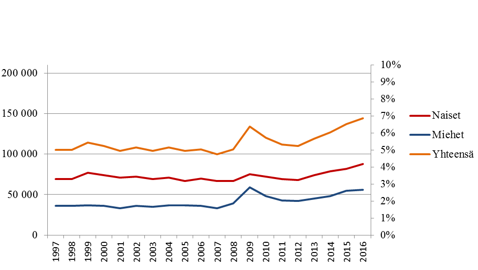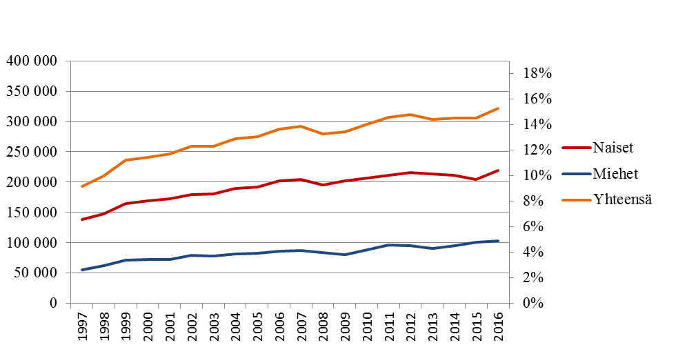 Osa-aikatyötä tekevien työntekijöiden osuus palkansaajista on kasvanut selvästi koko 2000-luvun ajan. Muutoksen selittää varsinkin naisten tekemän osa-aikatyön lisääntyminen. Tilastokeskuksen työvoimatutkimuksen mukaan Suomessa oli osa-aikaisia työntekijöitä yhteensä noin 320 000 vuonna 2016. Kuviosta 1 ilmenee, että naiset työskentelevät huomattavasti miehiä useammin osa-aikaisena.