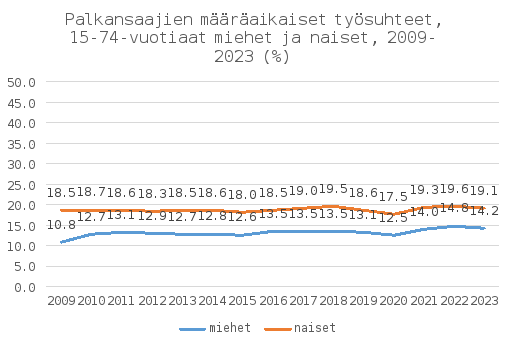 Määräaikaisten työsuhteiden yleisyyden sukupuolieroja selittää osin Suomen työmarkkinoiden jakautuminen nais- ja miesvaltaisiin aloihin, sekä valtaosin naisten pitämät pitkät perhevapaat, jotka luovat tarvetta sijaisuuksille. Sutela, H., Viinikka, J. & Pärnänen, A. Työolot murrosten keskellä – Työolotutkimuksen tuloksia 1977–2023, 60–62. Helsinki: Tilastokeskus. Tilastokeskuksen Työvoimatutkimuksen mukaan yksityisellä sektorilla määräaikaiset työsuhteet jakautuvat melko tasaisesti miesten ja naisten kesken, kun taas julkisella sektorilla työskentelee enemmän määräaikaisia naisia kuin miehiä. Määräaikaiset työsuhteet ovat selvästi keskimääräistä yleisempiä myös eri vähemmistöryhmissä, muun muassa maahanmuuttajataustaisilla. Esimerkiksi EU:n perusoikeusviraston vuonna 2022 laatiman kyselytutkimuksen mukaan määräaikaisten työsuhteiden osuus on afrikkalaistaustaisilla palkansaajilla yli kaksi kertaa suurempi kuin koko väestön keskuudessa.