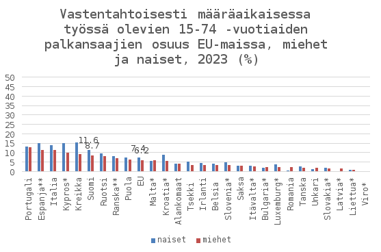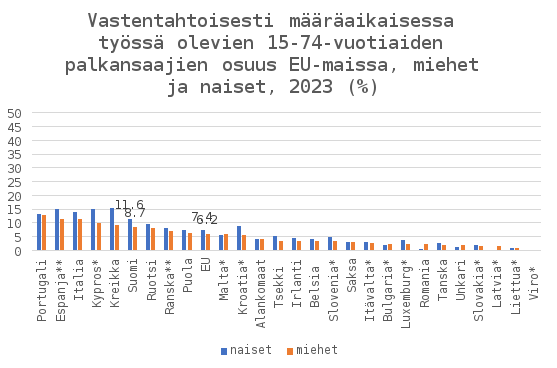 Nykytilan kuvauksessa jaksossa 2.3.1 kerrottiin määräaikaisten kokemuksista, joissa on joitain selkeitä eroja miesten ja naisten kesken. Vuoden 2023 Työolotutkimuksen Sutela, H., Viinikka, J. & Pärnänen, A. Työolot murrosten keskellä – Työolotutkimuksen tuloksia 1977–2023, 60–62. Helsinki: Tilastokeskus. mukaan määräaikaiset miehet useammin kuin naiset vaihtavat mielellään työpaikkaa tai tehtäviä, naiset puolestaan kokevat määräaikaisuuden henkisesti rasittavana miehiä useammin ja selvästi useampi määräaikainen nainen kuin mies kertoo kokeneensa syrjintää työsuhteen laadun vuoksi. Määräaikaisista miehistä useampi kuin naisista arvioi jatkavansa määräaikaisuuden jälkeen vakinaisessa työssä, kun taas naiset miehiä useammin arvelevat, että he jatkavat uudessa määräaikaisessa työssä. Miehet puolestaan arvioivat naisia useammin joutuvansa määräaikaisen työsuhteen päätyttyä työttömäksi.