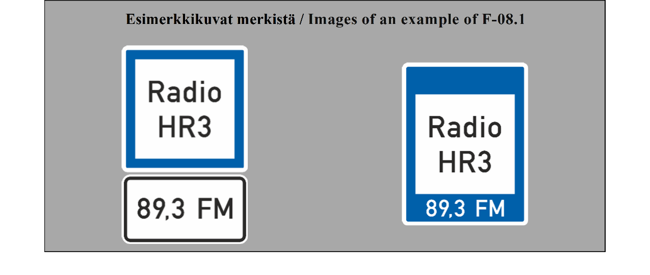 Kirjoitus valkoisessa neliössä: Sanan ”radio” alla voi tarvittaessa olla radioaseman nimi tai tunnus lyhennetyssä muodossa ja ohjelman numero. Sana ”Radio” voidaan toistaa myös kansallisella kielellä.