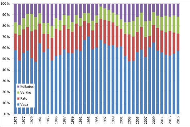 Kuva 2. Eri pyyntivälineiden prosentuaalinen osuus lohisaaliin kokonaispainosta Norjassa ja Suomessa. Kuvassa Suomen puolen pato- ja verkkosaalis on yhdistetty verkkosaaliiksi vuosina 1975–1979.