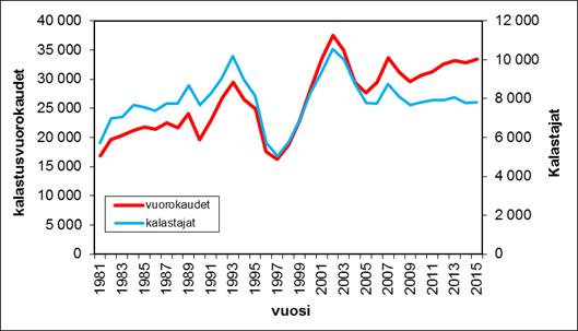 Kuva 3. Tenon-Inarinjoen kalastusmatkailijoiden lukumäärä sekä kalastusvuorokausien lukumäärä Suomen puolella 1981–2011