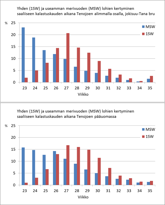 Kuva 4. Yhden merivuoden lohien (1SW) ja useamman merivuoden lohien (MSW) saaliin kertyminen Tenojoella aivan joen alaosalla, mikä kuvaa lohien nousun ajoittumista sekä koko pääuoman matkalla, jossa vaikuttaa nousun ajoittumisen lisäksi selvästi koko jokialueen kalastus, mm. matkailijoiden vapakalastus. Kuva Luonnonvarakeskuksen aineistosta 2000-luvulta.