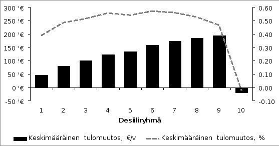 Kokonaisuutena katsottuna työn verotus kiristyy tulovälillä noin 0—14 300 sekä yli 24 000 euroa vuodessa ansaitsevilla, kun otetaan huomioon ansiotason nousu sekä palkansaajan veronluonteisten maksujen muutokset. Keskituloisen kohdalla verotus kiristyy noin 0,4 prosenttiyksiköllä ja enimmillään noin 0,56 prosenttiyksiköllä.