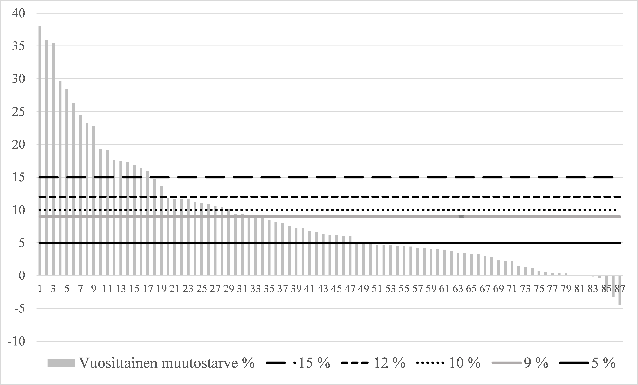 Alla olevassa kuvassa 7 on esitetty verkonhaltijoiden liikevaihdon korotustarve, jotta ne voisivat kerätä perustuslakivaliokunnan lausunnon mukaisesti Energiaviraston vahvistamien tariffien laskentamenetelmien mukaisen sallitun tuoton myös edellisen kauden alijäämän osalta. Liikevaihto on laskettu kuvassa ilman veroja, koska Energiavirastolla ei ole tietoja jakeluverkonhaltijoiden asiakasryhmilleen siirtämien energiamäärien jakaumasta. Verojen vaikutusta korotuskaton ylärajan arvoihin ei tämän vuoksi ole voitu ottaa laskelmassa huomioon. Koska korotuskatto lasketaan kunkin asiakasryhmän verollisista siirto- ja jakelumaksuista, ovat jakeluverkonhaltijoiden hinnankorotusmahdollisuudet tosiasiassa korkeammat kuvassa käytettyihin vertailuarvoihin verrattuna. Esimerkiksi asiakasryhmissä, joissa on kuluttaja-asiakkaita, 15 prosentin korotuskatto merkitsee noin 24 prosentin korotusmahdollisuutta jakeluverkonhaltijan osuuteen jakelulaskusta ja asiakasryhmissä, joissa on teollisuusasiakkaita, noin 22 prosentin korotusmahdollisuutta jakeluverkonhaltijan osuuteen jakelulaskusta. Kuvassa on oletettu, että yhtiöt keräisivät vuonna 2019 päättyneeltä valvontajaksolta syntyneen alijäämänsä Energiaviraston myöntämän poikkeusluvan turvin kahden seuraavan valvontajakson aikana vuosina 2020—2027. Kuvan perusteella nähdään, että jo nykyinen 15 prosentin korotusraja eli noin 22—24 prosentin jakeluhinnan nosto leikkaa noin 10 verkonhaltijalta mahdollisuuden kerätä vuonna 2019 päättyneellä valvontajaksolla kertyneen alijäämänsä kahden seuraavan jakson aikana. Mitä alemmas rajaa lasketaan, sitä useampaan verkonhaltijaan raja tulee vaikuttamaan.