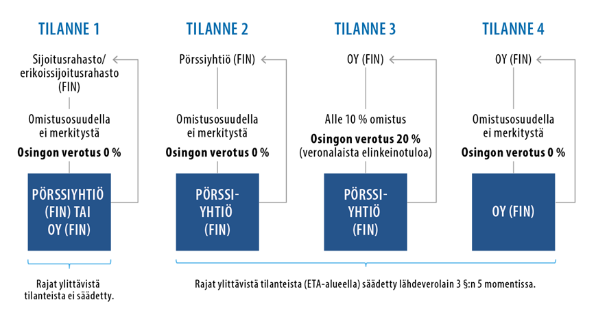 Osingosta perittävän lähdeveron määrä riippuu lähdeverolain ja mahdollisesti sovellettavaksi tulevan verosopimuksen määräyksistä. Lähdeveron perimisen voi estää myös EU-oikeus. Useissa tilanteissa lähdevero jääkin perimättä SEUT:n mukaisen pääomien vapaata liikkuvuutta koskevan perusvapauden nojalla. Ulkomaisen rahaston saadessa Suomesta kiinteistötuloa tulon veronalaisuus riippuu siitä, rinnastetaanko rahasto osakeyhtiöön vai erikoissijoitusrahastoon. Jos rahasto rinnastetaan osakeyhtiöön, saatu kiinteistötulo on koko määrältään veronalaista tuloa Suomessa. Verosopimukset eivät yleensä estä Suomea verottamasta Suomesta saatua kiinteistötuloa. Jos rahasto rinnastetaan erikoissijoitusrahastoon, saatu kiinteistötulo on verovapaata tuloa Suomessa.