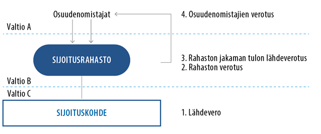 Rajat ylittäviin tilanteisiin liittyviä verokysymyksiä on tarkasteltu laajasti eri sijoitusmuotojen verokohtelua arvioineessa työryhmässä. Työryhmäraportin mukaan rajat ylittävään sijoitusrahastotoimintaan voi kohdistua verotusta ainakin kolmessa eri valtiossa; sijoitusrahaston tekemän sijoituksen kohdevaltiossa, itse sijoitusrahaston sijaintivaltiossa sekä rahastosijoittajan (osuudenomistajan) asuinvaltiossa. Tulovirtoihin kohdistuvan verotuksen voidaan täten ajatella tapahtuvan neljässä eri kohdassa; sijoituksen tuottaman tulon verotus lähteellä, rahaston saaman tulon verotus sen sijaintivaltiossa, rahaston jakaman tulon lähdeverotus sen sijaintivaltiossa sekä rahastosijoittajan verotus sijoittajan asuinvaltiossa. Tilannetta on havainnollistettu seuraavalla kuvalla: