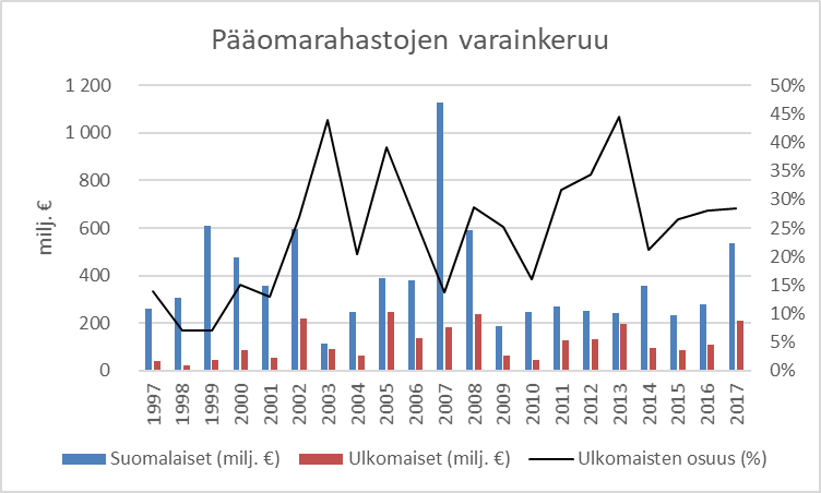 Kotimaisten ja ulkomaisten sijoittajien osuutta suomalaisten pääomarahastojen varainkeruussa vuosina 1997—2016 on kuvattu alla.