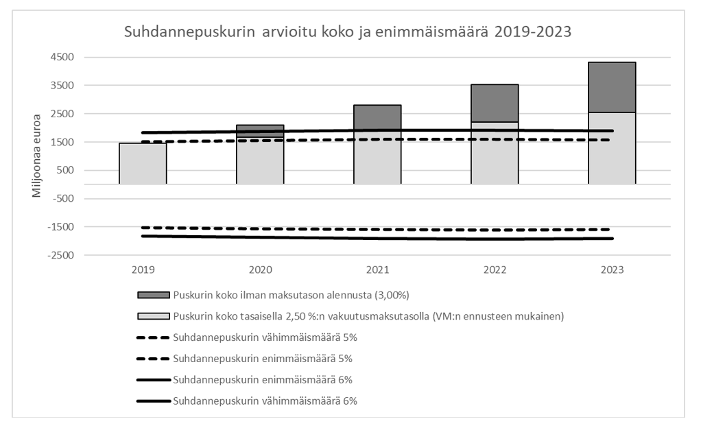 Lisäksi 2 momenttiin ehdotetaan lisättäväksi virke, jonka mukaan puskurin velan enimmäismäärä voisi kuitenkin olla 300 miljoonaa euroa suurempi kuin 6,0 prosenttiyksikön työttömyysastetta vastaavien menojen suuruus. Lisäyksellä mahdollistettaisiin, että suhdannepuskurin velkapuolta voitaisiin käyttää maksutason tasaamisessa samassa mitassa kuin saamapuolta.