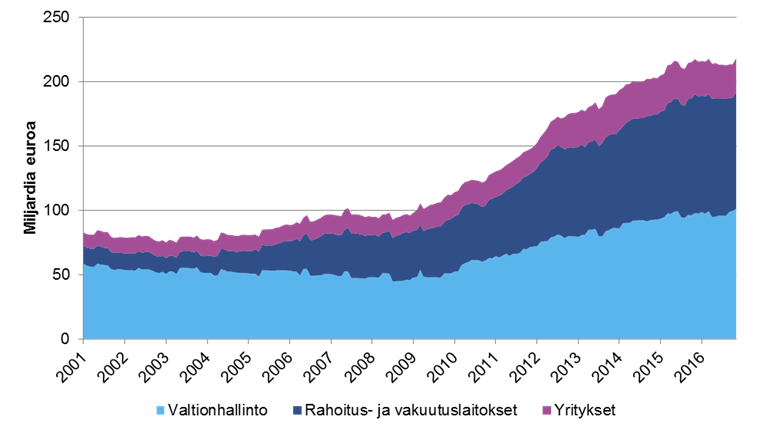 Kuva 5. Finanssikriisin jälkeen yritysten liikkeeseen laskemien joukkolainojen määrä on kasvanut vuosina 2001—11/2016