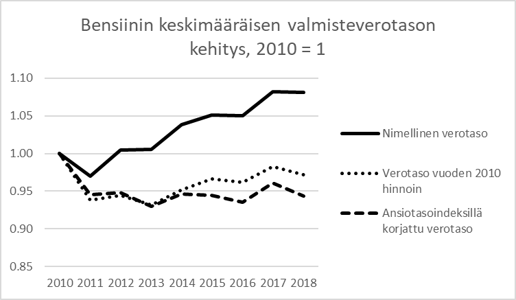 Liikennepolttoaineiden nimellisten valmisteverotasojen noususta huolimatta myöskään bensiinin reaalinen valmisteverotaso ei ole noussut 2010-luvulla, sillä kuluttajahinnat ja kotitalouksien käytettävissä olevat tulot ovat nousseet keskimääräistä valmisteverotasoa enemmän. Vuonna 2018 bensiinin valmisteverotaso oli kuluttajahintaindeksillä deflatoituna noin kolme prosenttia alhaisempi ja ansiotasoindeksillä deflatoituna noin viisi prosenttia alhaisempi kuin vuonna 2010.