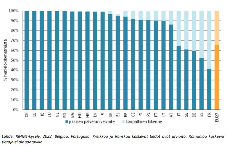Kuva 1 COM(2023) 510 final. Julkisen velvoitteen piiriin kuuluvan henkilöliikenteen osuus ja kaupallisen henkilöliikenteen osuus maittain (prosenttia henkilökilometreistä 2020)