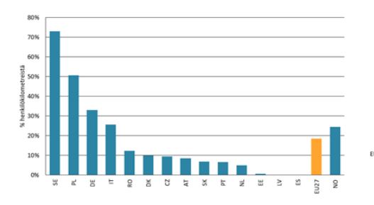 Komission seurantaraportin mukaan vuonna 2020 kertyneistä julkisen palvelun velvoitteen 149 miljoonasta henkilökilometristä 28 prosenttia oli kilpailutettuja palveluita. Suhteellisesti katsottuna 92 prosenttia kaikista EU:n alueella järjestetyistä tarjouskilpailuista tehtiin Saksassa ja Ruotsissa, missä palvelut on vapautettu varhaisessa vaiheessa. Näistä tarjouskilpailuista 80 prosenttia järjestettiin Saksassa ja 12 prosenttia Ruotsissa. Uusien tulokkaiden markkinaosuus julkisen palvelun velvoitteen piiriin kuuluvan henkilöliikenteen markkinoista on suurin Ruotsissa, Puolassa ja Saksassa. Uusien tulokkaiden markkinaosuus on kasvanut vuosina 2015–2020 eniten Ruotsissa ja Saksassa. Uusien tulokkaiden markkinaosuus oli vuonna 2020 kaupallisessa liikenteessä keskimäärin 6,6 prosenttia ja 18,5 prosenttia kansallisilla julkisen palvelun velvoitteen piiriin kuuluvan henkilöliikenteen markkinoilla. COM(2023) 510 final Uusien tulokkaiden markkinaosuus on siis ollut suurempi julkisen palvelun velvoitteen piiriin kuuluvassa liikenteessä kuin markkinaehtoisessa liikenteessä.