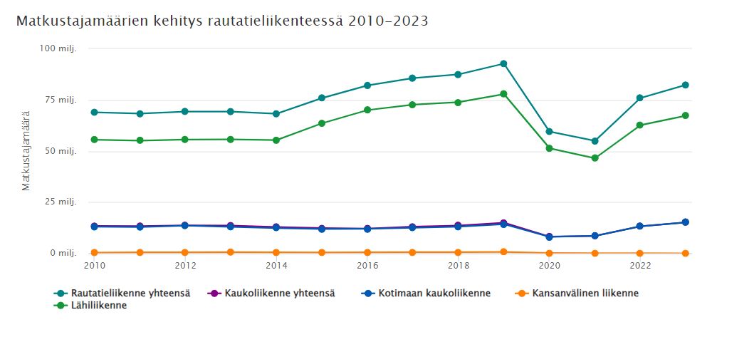 Henkilöjunaliikenteen matkustajamäärät Suomessa ovat olleet kasvussa viime vuosikymmenellä. Lippujen hinnat ovat laskeneet vuodesta 2015 alkaen. Rautateiden matkustajamäärät kasvoivat 2010-luvun puolivälin jälkeen tasaisesti koronapandemiaan asti. Koronapandemian seurauksena matkustajamäärät vähenivät vuoteen 2021 mennessä noin 40 prosenttia lähiliikenteessä verrattuna vuoteen 2019. Kaukoliikenteessä matkustajamäärä väheni 43 prosenttia. Vuonna 2022 matkustajamäärät kääntyivät nousuun, ja rautatieliikenteen kokonaismatkustajamäärä kasvoi 38 prosenttia edelliseen vuoteen verrattuna. Vuonna 2023 kokonaismatkustajamäärä kasvoi kahdeksan prosenttia vuoteen 2022 verrattuna. Vuodesta 2022 vuoteen 2023 lähiliikenteen matkustajamäärä kasvoi seitsemän prosenttia ja kaukoliikenteen 14 prosenttia. Kansainvälisen rautatieliikenteen matkustajamäärät ovat vähentyneet entisestään Venäjän aloittaman hyökkäyssodan vuoksi, mutta kokonaisuutena rautatieliikenteen matkustajamäärä oli vuonna 2023 enää noin 11 prosenttia pienempi kuin vuonna 2019. Matkustajamäärissä mitattuna lähijunaliikenne on selvästi kaukojunaliikennettä suurempaa, mutta matkustajakilometreissä kaukojunaliikenne on selvästi merkitsevämpää. Lähijunaliikenteen matkustajamääriä ovat kasvattaneet kaupunkirataliikenteen laajeneminen ja esimerkiksi Kehäradan avautuminen näkyy selvästi matkustajamäärissä vuonna 2015.