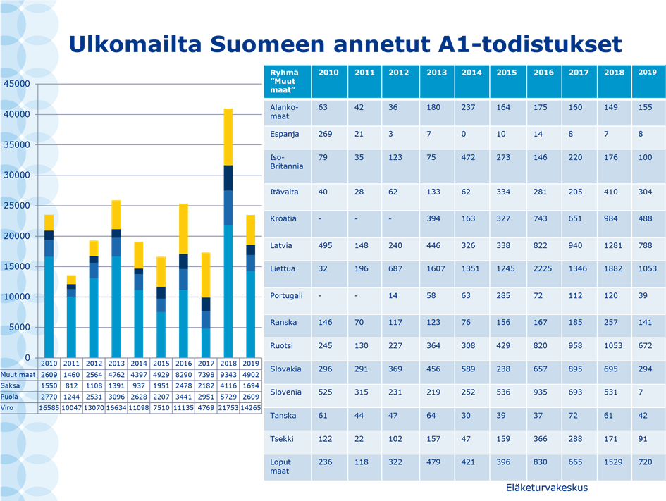 Täysin luotettavaa ja tarkkaa tietoa Suomeen lähetetyistä työntekijöistä ei ole saatavilla. Suomeen lähetetyistä työntekijöistä on tilastotietoja saatavissa ainoastaan EU:n jäsenmaiden sosiaaliturvaviranomaisten Suomeen annettujen A 1 -todistusten perusteella. Eläketurvakeskus vastaanottaa saamansa tiedot EU:n jäsenmaista Suomeen lähetetyistä työntekijöistä. Saatujen todistusten perusteella alla ovat tilastot maittain vuosilta 20102019. Tilastojen mukaan lähetettyjä työntekijöitä koskevia A1-todistuksia myönnetään eninten Virosta, Puolasta, Saksasta ja Liettuasta. Tilastoista ei ilmene lähetetyn työntekijän kansalaisuutta, vaan maa, jonka kautta työntekijä on lähetetty Suomeen. Lisäksi sama työntekijä voi olla tilastoituna useamman kerran.