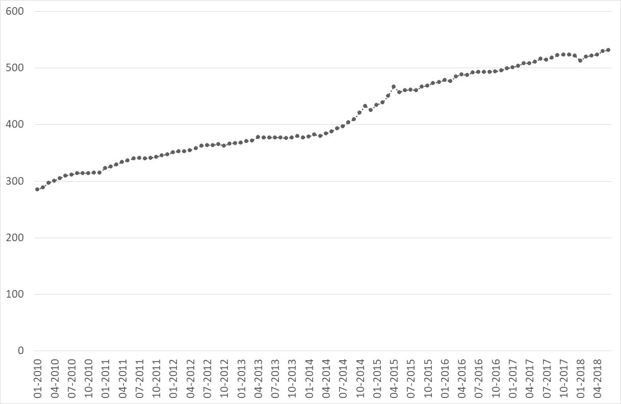 Kuva 1. Katsastustoimipaikkojen lukumäärän kehitys vuosina 2010–2018. Lähde: Liikenteen turvallisuusvirasto.