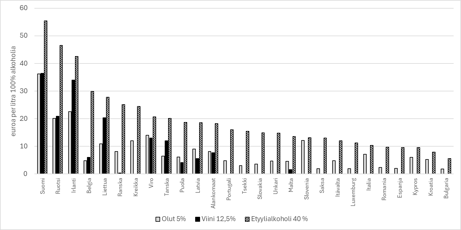 Alla olevassa kuviossa 1 on esitetty EU:n jäsenvaltioiden verotasot eräiden alkoholijuomien osalta vuoden 2025 alussa sataprosenttista alkoholilitraa kohti. Kuten kuviosta nähdään, alkoholijuomien verotus eroaa kaikissa jäsenvaltioissa merkittävästi toisistaan valmistustavan mukaan. Etyylialkoholijuomaryhmän juomia verotetaan tyypillisesti kireämmin kuin viiniä ja olutta. Reilu puolet EU:n jäsenvaltioista ei verota lainkaan viiniä, ja useissa jäsenvaltioissa oluen alkoholivero on matala. Kuviosta nähdään myös, että alkoholin verotus on selvästi kireintä Suomessa.