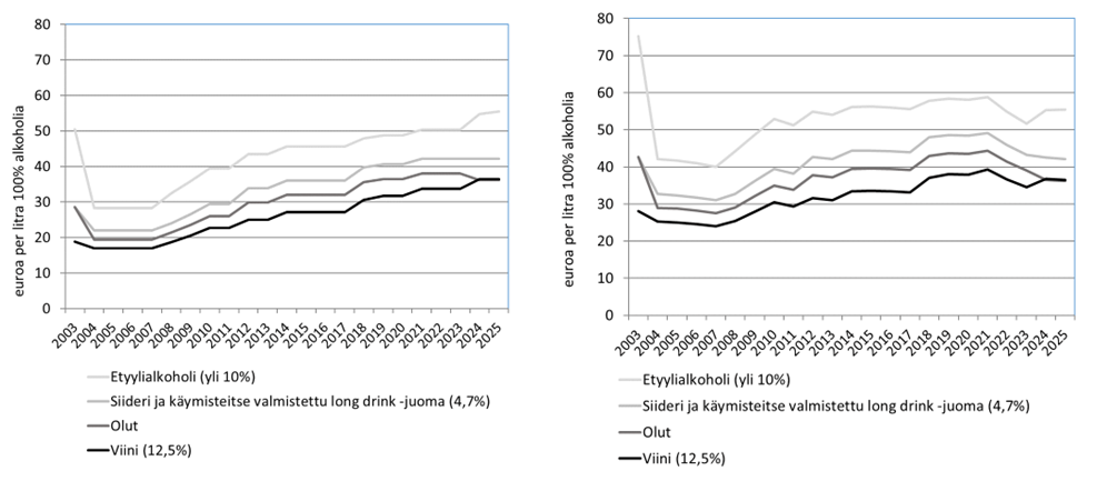 Alla oleva kuvio 2 havainnollistaa sitä, miten alkoholiverotasot ovat muuttuneet nimellisesti ja reaalisesti vuoden 2025 tasossa. Kuviossa esitetään eräiden juomaryhmien alkoholiveron tasot suhteessa juoman alkoholisisältöön. Kuvio osoittaa, että alkoholiverotus ei ole kiristynyt merkittävästi vuodesta 2008 tehdyistä lukuisista veronkorotuksista huolimatta, jos huomioidaan yleinen hintojen nousu. Alkoholivero on yksikkövero, jota on korotettava säännöllisesti, jos halutaan välttää verotuksen reaalisen tason ja sen myötä vero-ohjauksen sekä verotuottojen aleneminen.