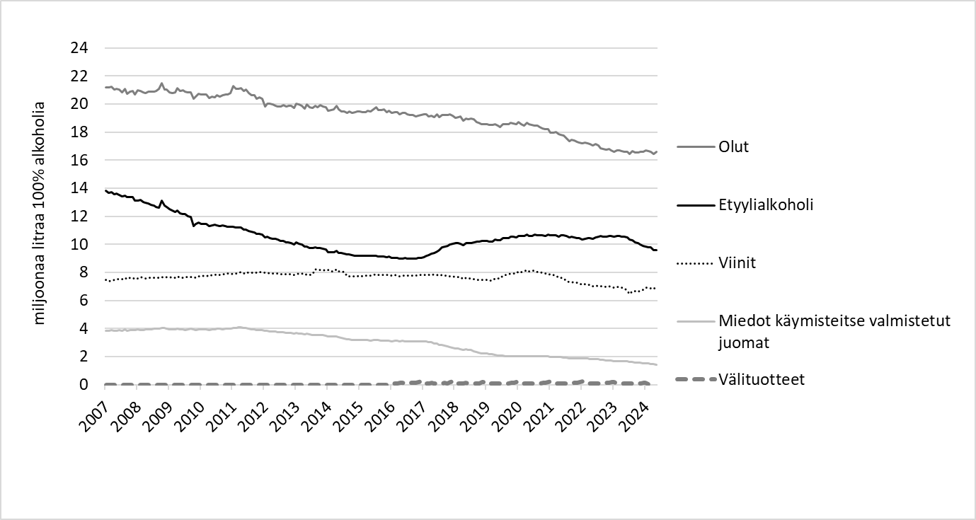 Alkoholijuomien kokonaiskulutus on ollut Suomessa pitkään laskussa. Kokonaiskulutus on laskenut vuoden 2005 12,1 litrasta sataprosenttista alkoholia 15 vuotta täyttänyttä kohti 9,8 litraan vuonna 2019 ja 8,3 litraan vuonna 2024.