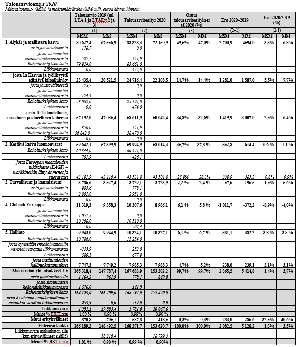 Vuoden 2020 talousarvioesityksen kokonaissumma sitoumuksina on rahoituskehyksen sisäpuolelle kuuluvien ohjelmien osalta 167 683,9 miljoonaa euroa (0,99 % EU:n BKTL:sta). Maksuina esityksen kokonaistaso on 153 202,2 miljoonaa euroa (0,90 % EU:n BKTL:sta). Kun mukaan lasketaan rahoituskehyksen ulkopuoliset erityisvälineet, talousarvioesityksen kokonaissumma on sitoumuksina 168 271,7 miljoonaa euroa (0,99 % EU:n BKTL:sta) ja maksuina 153 620,7 miljoonaa euroa (0,90 % EU:n BKTL:sta). Kokonaisuutena maksusitoumukset kasvavat 1,3 % ja maksut 3,5 % vuoteen 2019 verrattuna.