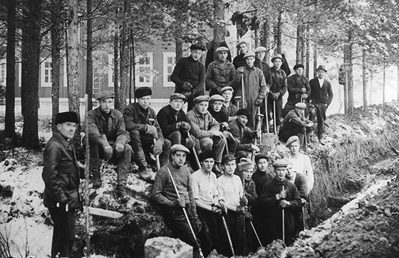 Lantmätarskolans pojkar gräver splitterskydd på samlyceets gård. Till vänster skolans direktör Oskari Valanne. Bild: Väinö Marttila.