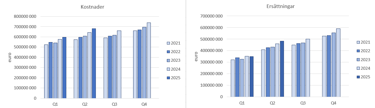 År 2023 utbetalades sammanlagt 1 792 miljoner euro i ersättningar för läkemedel. De grundersättningsgilla läkemedlens andel var 350 miljoner euro och de specialersättningsgilla läkemedlens 1 168 miljoner euro. På grund av att den årliga självriskandelen överskridits betalades tilläggsersättningar på 274 miljoner euro. År 2024 uppgick läkemedelsersättningarna till 1 898 miljoner euro. Ersättningarna fördelade sig på följande sätt: för de grundersättningsgilla läkemedlen betalades 380 miljoner euro, för läkemedlen i den övre specialersättningsklassen 742 miljoner euro och för läkemedlen i den nedre specialersättningsklassen 482 miljoner euro. I tilläggsersättningar betalades 294 miljoner euro ut (Finlands läkemedelsstatistik 2023 och Finlands läkemedelsstatistik 2024).