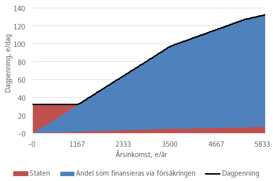 I samband med kanaliseringslösningen föreslås slopande av statens finansieringsandel på fem procent (omkring 112 miljoner euro på 2025 års nivå), som hänför sig till kostnaderna för dagpenningsförmånen och rehabiliteringspenningen enligt 18 kap. 13 § 3 mom. i sjukförsäkringslagen. I dimensioneringen av ändringen av finansieringsandelarna för sjukförsäkringen har man beaktat såväl statens ökande finansieringsansvar för grunddagpenningsutgiften i arbetslöshetsskyddet som det minskande ansvaret för grunddagpenningsförmåns- och rehabiliteringspenningskostnaden enligt sjukförsäkringslagen.