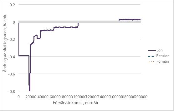 Tabell 7 visar konsekvenserna av kanaliseringslösningen för löntagarnas avgifter och beskattning i 2026 års nivå. Sänkningen av arbetslöshetsförsäkringspremien och dagpenningspremien, vilka är avdragbara från den beskattningsbara inkomsten, ökar den beskattningsbara inkomsten, varvid de skatter som tas ut av löntagarna ökar. Den sjukvårdspremie som tas ut utifrån löneinkomsten stiger. Löntagarnas skatte- och avgiftsbörda minskar med omkring 80 miljoner netto från och med år 2026. På så sätt kompenseras konsekvenserna av den kanaliseringslösning som genomfördes i början av år 2024, där kanaliseringen riktades uteslutande på löntagarna genom dimensioneringen av indexjusteringen vid beskattningen av förvärvsinkomst. Slutresultatet är att besparingarna och kanaliseringslösningarna inte har väsentliga konsekvenser för löntagarnas skatte- och avgiftsbörda, det vill säga att den hålls så gott som på 2023 års nivå. Små ändringar i skatte- och avgiftsbördan är dock möjliga på grund av avrundningarna i finansieringsandelen för sjukförsäkringen och de osäkerheter som är förknippade med antagandena i beräkningarna.