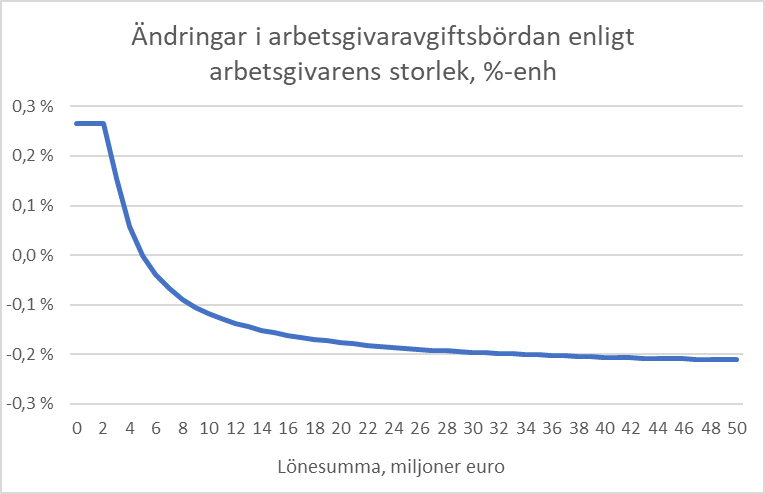 Följaktligen leder den kanalisering som görs på en gång till att de privata arbetsgivarnas skatte- och avgiftsbörda ökar under år 2025 med omkring 30 miljoner euro jämfört med det alternativ där kanaliseringen görs stegvis. Jämfört med år 2023 ökar skatte- och avgiftsbördan för privata arbetsgivare däremot klart mindre, med omkring 10 miljoner euro. Dessutom ska det i detta samband beaktas att den kanaliseringslösning som genomfördes i början av år 2024 riktade sig endast på löntagare och man i den noggranna stegvisa kanaliseringen bör beakta att de privata arbetsgivarnas skatte- och avgiftsbörda sänks med omkring 60 miljoner euro för år 2024.