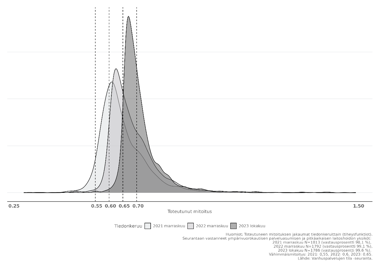 I figur 1 beskrivs enheternas fördelning enligt den faktiska dimensioneringen 2021–-2023 (källa THL:s uppföljning av äldreomsorgen). Figuren visar att när den lagstadgade minimidimensioneringen har stigit har dimensioneringen för största delen av enheterna alltid varit något högre än den gängse minimidimensioneringen (lagstadgad minimidimensionering 2021: 0,55, 2022: 0,6 och fr.o.m. 1.4.2023: 0,65).