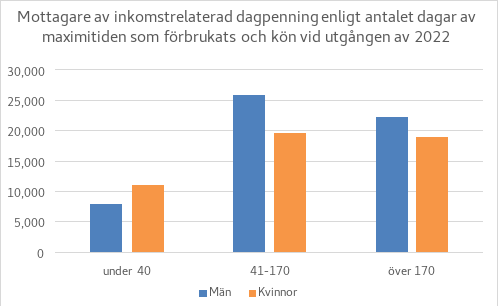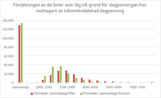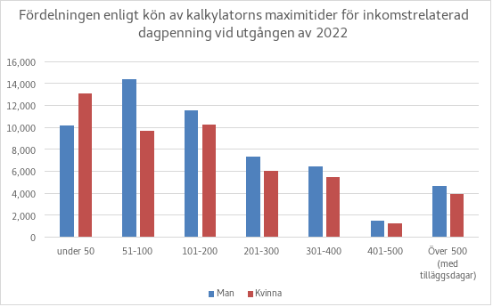 Cirka 49 procent av dem som fick inkomstrelaterad dagpenning år 2022 var män och cirka 51 procent kvinnor. Figur 1 visar fördelningen av de löner som låg till grund för inkomstrelaterad dagpenning 2022. Av figuren framgår att de löner som låg till grund för dagpenningen och därigenom nivån på den inkomstrelaterade dagpenningen var klart lägre för kvinnor än för män. Bakom detta ligger arbetsmarknadens könssegrerade struktur: kvinnors löner är i genomsnitt lägre än mäns. Utöver detta utför kvinnor också mer arbete på deltid än män gör. Av dessa orsaker är kvinnors försäkringslöner lägre än mäns.